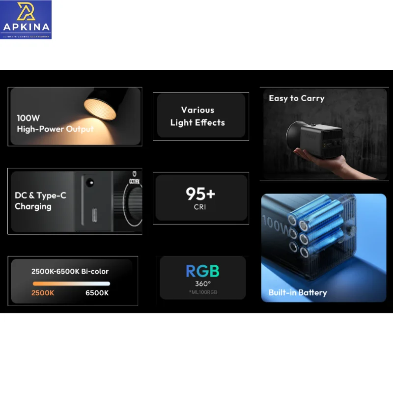 Whether you’re shooting YouTube videos, TikTok content, product photography, interviews, or cinematic scenes, the APKINA 100 Pro delivers consistent, high-output lighting with accurate color reproduction. Its compact and portable design, combined with a built-in rechargeable battery, makes it ideal for both studio setups and outdoor shoots.